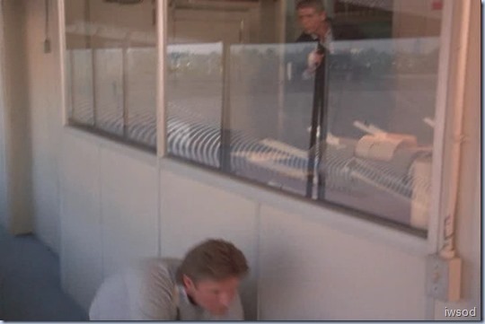 Alexi goes into the booth and looks down to where Lee is moving. He turns and runs out of the booth. Lee runs back to the booth windows.)