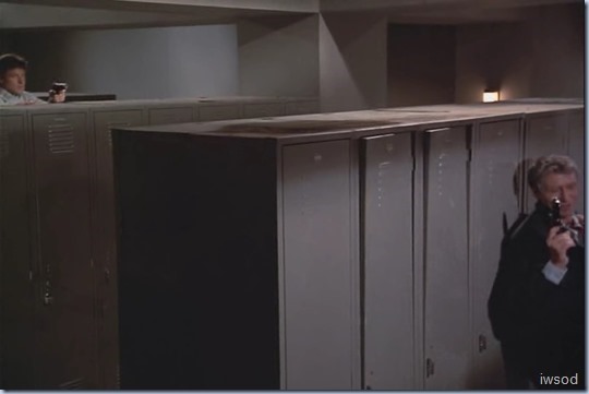 Lots of weaving, peeking around corners, ducking, shooting etc… then, Alexi tries to shove a row of lockers on Lee and fails because a bench stops the weight from hitting Lee.