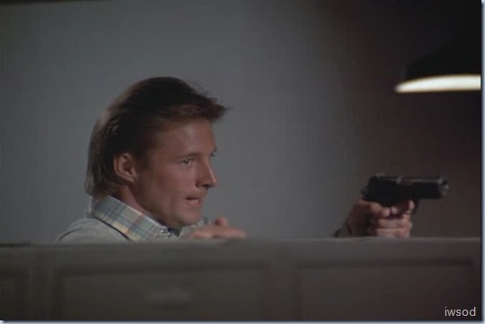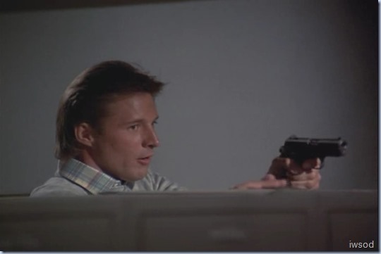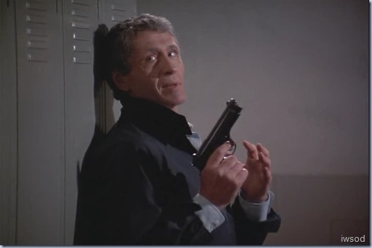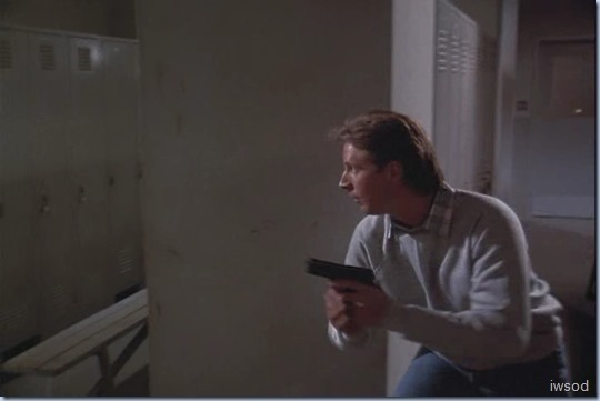 Lee gives him a punch, grabs his gun and then hides behind the lockers again – why??!!! I have no idea.. But Alexi still has his gun too and we are back to the game of chicken. Only.. Lee didn’t get that full clip into his gun! He knows Lee’s gun isn’t loaded.. Alexi picks it up and throws it into some kind of water bath. Lee notices, and puts another clip in his gun so Alexi hears – maybe a bluff because Alexi can’t be sure if Lee had another full clip, or if that was Lee putting the empty clip in to fool him…