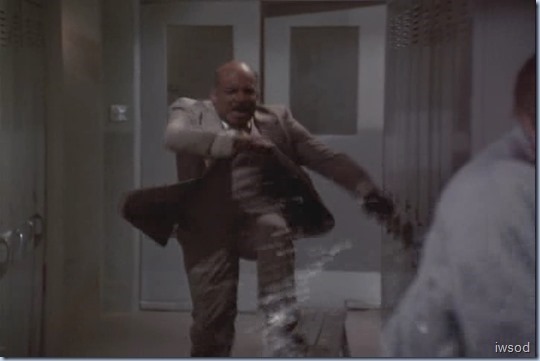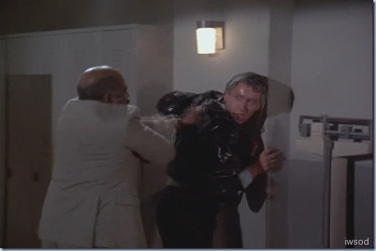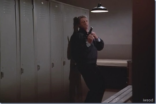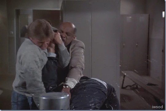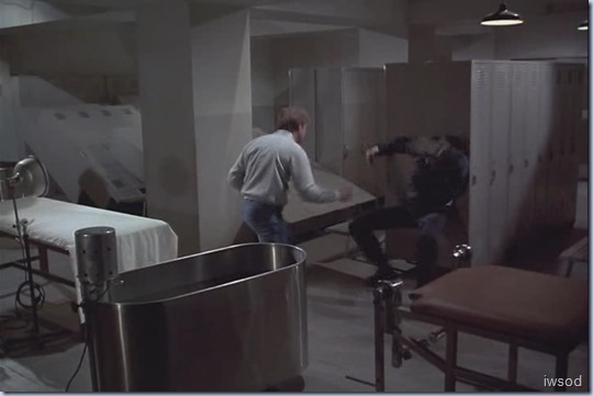 The ubiquitous final action scenes get to be a bit much when they get so drawn out. Sometimes I’m screaming, “Enough already!! Just get on with it!!” The rounded metal thing that looks like a bath is actually a whirlpool for athletes. It’s used in hydrotherapy for sports injuries to hips, backs, ankles, knees, etc., typical locker room equipment.