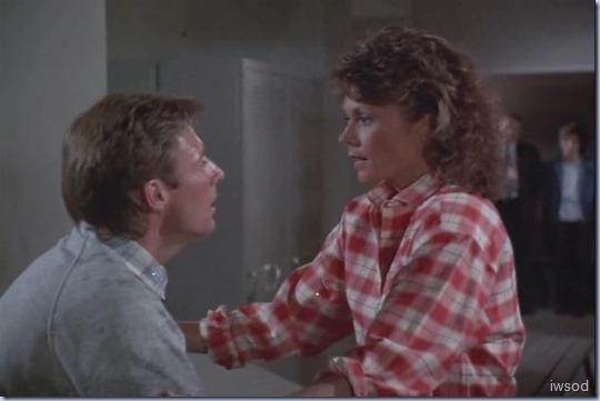 Anyway, this has gone on long enough. Meh. Finish it up you two! Lee puts his gun on the bench. He pushes something on one side of Alexi, and another thing down the other (don’t care what it is yawn. Get on with it!) – and quickly jumps over the lockers and on to Alexi – ![]()