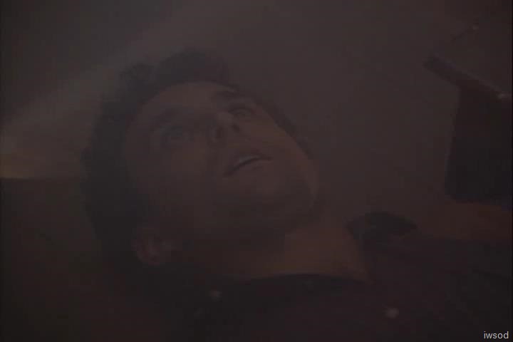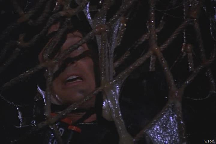 {Lee stands up and takes a step back. He suddenly falls through a trap door on the floor and lands in a slimy fishing net. NOTE: The script lists this as a viscid hardening foam.}![]()
