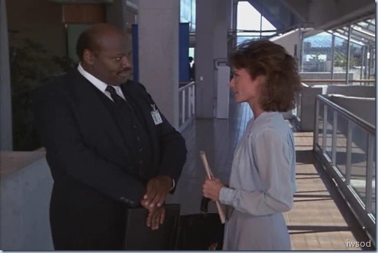 In the southern states, such as Virginia, politeness overall and courtesy toward women was (and in places still is) prevalent longer than the northern and western states. We’ve seen Lee open car doors and building doors for Amanda plenty of times. Plus, it appears that Security Sam is required to escort her throughout the building. Must admit I was frustrated when he piles even more folders onto what she already has, but decided to give him a pass thinking he may be required to keep a hand free while on duty.