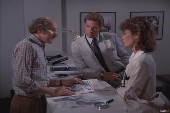 (Scene shifts to Agency photo lab. A blown up photo of Amanda. Shot widens to show Lee and Amanda behind a work surface, with photos framed on the wall behind them. Amanda is holding up blown up photo. A man with glasses is standing behind the work surface, holding the original newspaper) ![]()