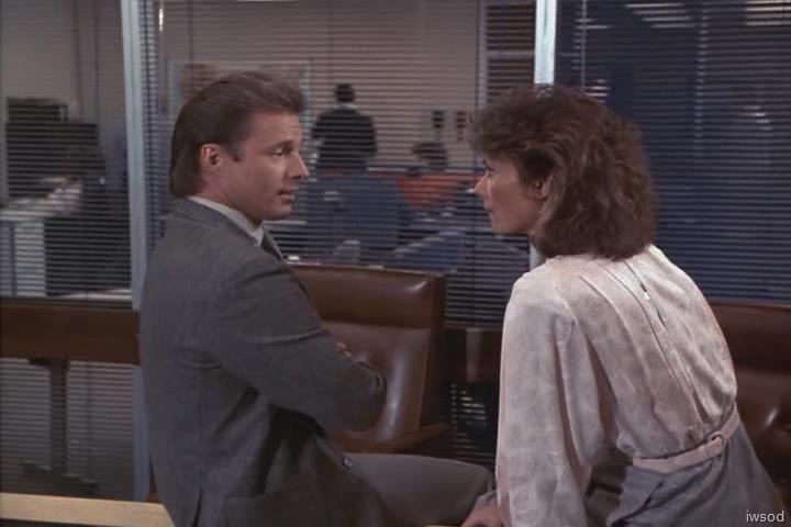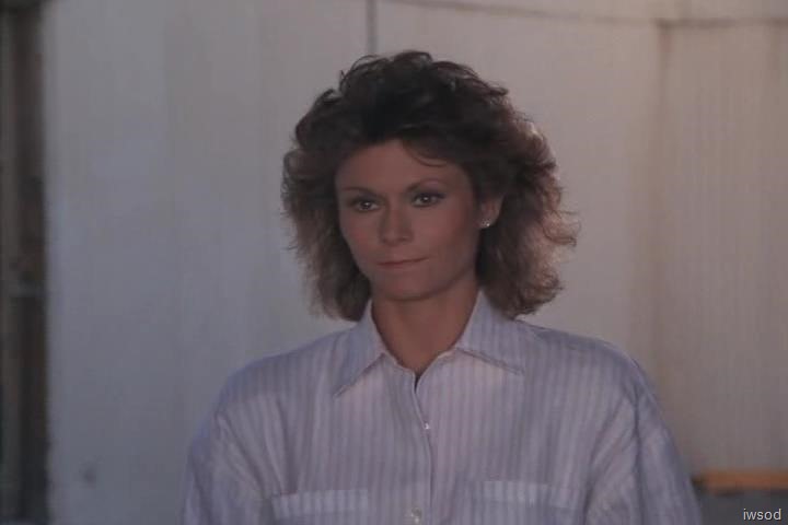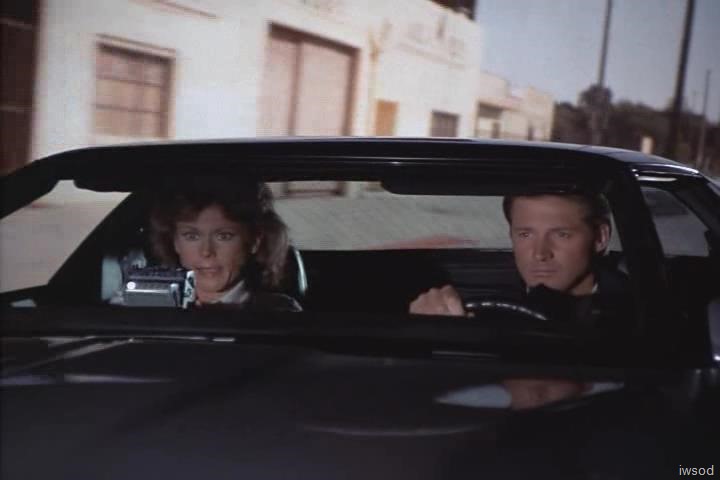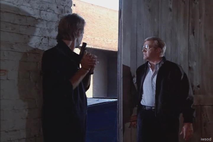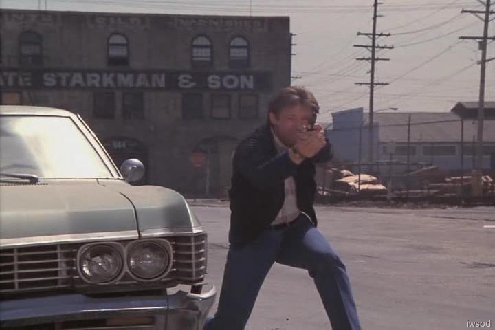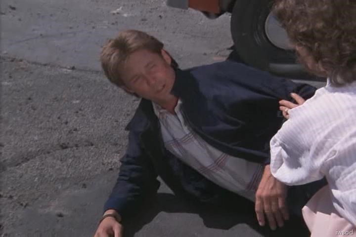 (Amanda gets out of the Corvette. Janitor No. 1 heads back toward the interior of the warehouse. Williamson follows him. We see Lee running toward the warehouse from the Corvette. Amanda gets out as soon as he gets ahead of the car. Janitor No. 1 is shown coming along the side of the warehouse. Cuts to Williamson inside picking up a grenade and a rifle. He walks to the garage door again. Cuts to Amanda getting into the driver’s seat of the Corvette. She picks up the car phone. Cuts to Lee running toward the warehouse. Janitor No. 2 shoots at him from the second floor window several times. Amanda looks up. Lee takes cover behind an old car, then shoots twice at Janitor No. 2. He is hit, gasps and falls out of the window. Cut to Lee, moving carefully out from behind the cover of the car. Janitor No. 1 comes around the side of the building and shoots at Lee, breaking a front light on the car. Lee takes cover again behind the old car. Lee shoots and hits Janitor No 2, who falls out the second floor. ![]()