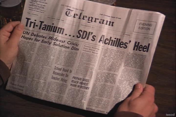 Charlie:  Don’t bluff me, Stetson.  You know the next generation, SDI weapons is totally dependent on Tritanium.  Gunning’s undisclosed source says we ain’t got enough.