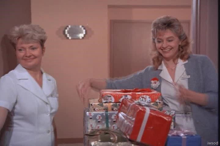 {The door opens and some nurses wheel in a cart of presents.}![]()