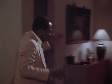 No sign of the phone, but we do see Lee’s answering machine at the end of the couch on a small sofa table. This seems to be near the kitchen door, which is closed.
