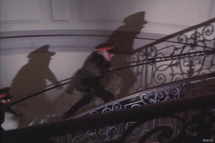 Lee and Billy aim over the banister, fire and hit both guards. They go tumbling down the stairs.
