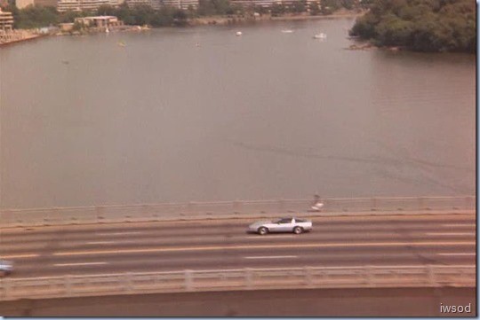 We cut to the corvette driving at a distance.. and listen to a voice over…