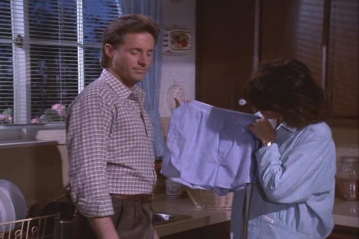 Lee (dismayed): Oh, no, not another sock. (He sets down his coffee and quickly steps over to join her at the laundry basket.)